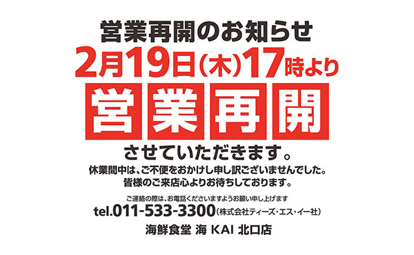 海鮮食堂 海<KAI> 海鮮食堂 海〈KAI〉営業再開のお知らせ 2026.02.17 ティーズ・エス・イー社 いつも海鮮食堂 海〈KAI〉北口店をご利用いただき誠にありがとうございます。配管設備工事のため臨時休業をいただいておりましたが 2月19日(木)17時(ディナータイム)より営業再開いたします。 休業期間中はご不便をおかけ…