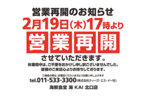 海鮮食堂 海〈KAI〉北口店 臨時休業のお知らせ